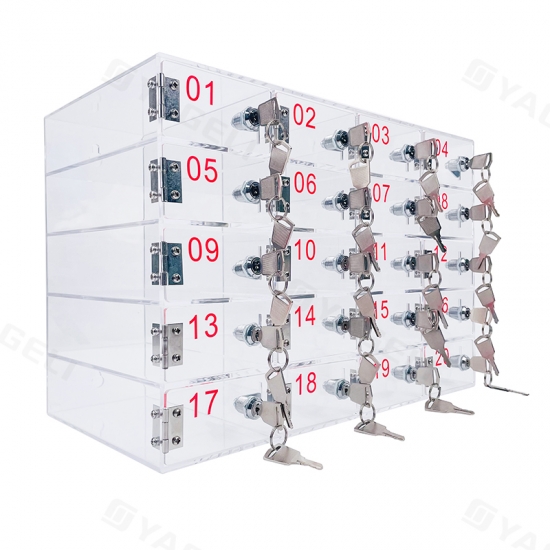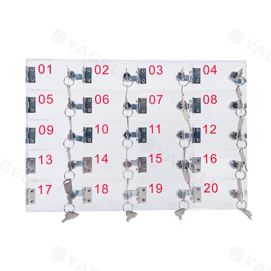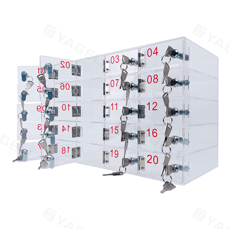 مصنوعة من الأكريليك الشفاف القوي، توفر هذه الخزانة رؤية شفافة لتسهيل التعرف على الجهاز؛ توفر حجراتها العشرون القابلة للقفل تخزينًا آمنًا وفرديًا لمنع السرقة، كما أن التصميم متعدد الاستخدامات يناسب مختلف الإعدادات مثل المكاتب أو المدارس، مما يجعلها حلاً عمليًا لتنظيم وحماية العديد من الأجهزة المحمولة.