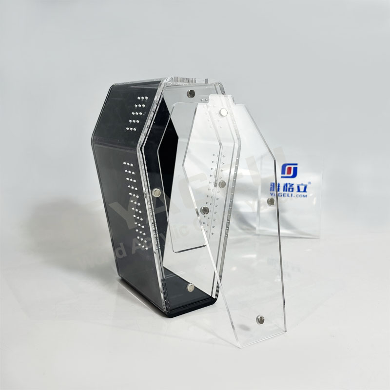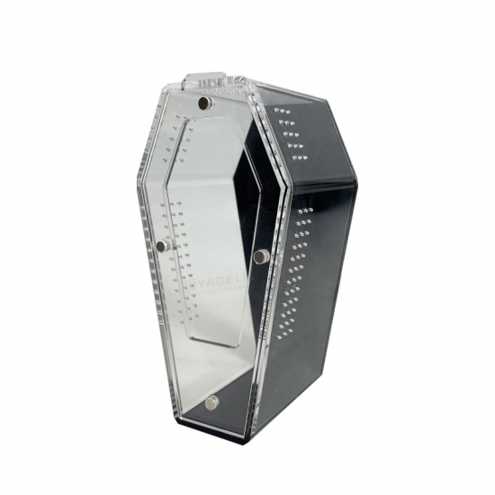 يتميز هذا المسكن بمقاومته العالية للأشعة فوق البنفسجية بنسبة 97%، وعلى عكس المساكن البلاستيكية التقليدية، فإن هيكله المصنوع من الأكريليك السميك مقاوم للكسر وخفيف الوزن في الوقت نفسه، كما يوفر ظهره الأسود خلفية عالية التباين تجعل ألوان العنكبوت وحركاته أكثر وضوحًا. تضمن فتحات التهوية المحفورة بدقة (المدمجة في التصميم) تدفقًا مثاليًا للهواء، بينما يمنع الإغلاق المحكم هروب العنكبوت دون التأثير على سهولة الوصول للتغذية أو الصيانة.